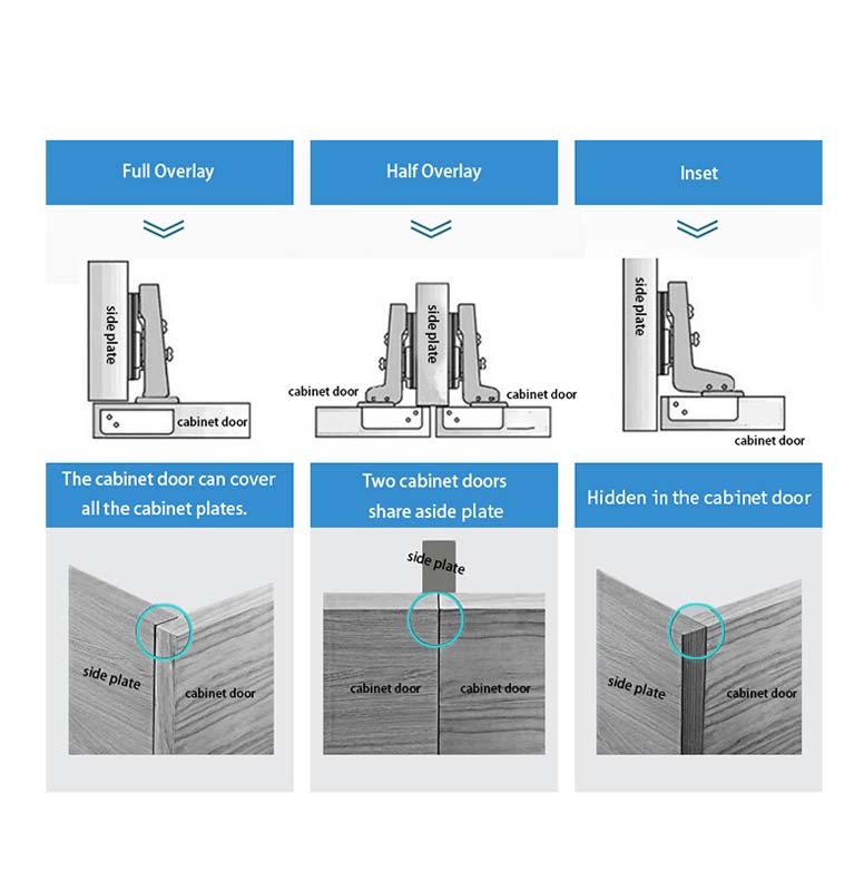 Three specifications: full overlay, half-overlay and inset .
